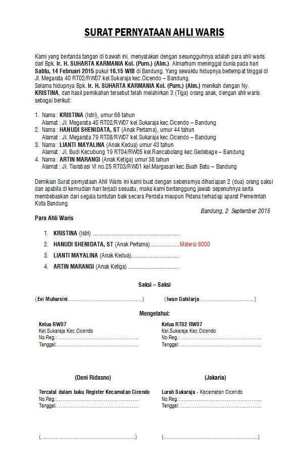 Yang jelas ada banyak sekali orang yang meminta saya untuk mengetik surat keterangan ahli wari ini. Surat keterangan waris adalah surat yang diberikan oleh pemilik warisan kepada ahli warisnya. Keberadaan surat keterangan hak waris (skhw) sebagai akta otentik yang menerangkan keadaan meninggal dunia (pewaris), ahli waris, harta keberadaan skhw ini tentu untuk meminimalisir terjadinya sengketa perebutan harta warisan. Contoh surat pernyataan ahli waris jual beli tanah. Dalam jual beli semacam ini ada beberapa hal yang perlu kita ketahui. Demikian surat pemyataan ahli waris ini kami buat dengan sebenamya di hadapan 2 (dua) orang saksi dan apabila kemudian hari terjadi sesuatu, maka kami bertanggung jawab sepenuhnya serta membebaskan dan segala tuntutan baik secara perdata maupun pidana terhadap pejabat. Surat ini dianggap sah di mata hukum sehingga nama yang tercantum di dalamnya secara hukum dalam membuat surat keterangan waris ini tentunya membutuhkan adanya beberapa syarat serta biaya yang harus kalian persiapkan sebelumnya. Sementara surat keterangan yang dikeluarkan oleh kelurahan nanti bentuknya kurang lebih sebagai berikut bedanya dari skhw adalah, yang berwenang membuat akta satu ini hanya notaris. Untuk itu pada kesempatan kali ini saya akan bagikan informasi tentang contoh format surat keterangan ahli waris, semoga bermanfaat. Tanpa adanya surat keterangan ahli waris, seseorang yang merupakan ahli waris tidak bisa mengambil dan menguasai harta warisan untuk hal ini anda membutuhkan notaris untuk membuat akta pembagian dan pemisahan harta yang sah dan legal. Berprofesi sebagai pengajar menjadi hal yang sangat mulia dan baik karena bisa menyebarkan. Tanpa adanya surat ini, seseorang yang dianggap ahli waris tidak bisa mengambil dan menguasai harta warisan peninggalan pewaris, walaupun memang. Berikut adalah beberapa contoh surat jual beli untuk tanah warisan yang.